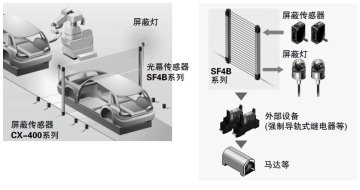 可根據使用現場的情況,從3種類型中選擇 光幕傳感器SF4B系列檢測范圍230〜1,910mm(Finger型到1,270mm)的豐富的變化。3種類型可以混合在一條直列上的連接。