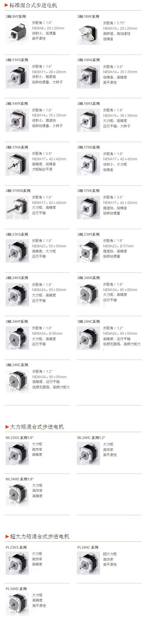 由于其機械設計的特性, 混合式步進電機可以實現非常精確的0.9°小增量步距運動, 與微步進驅動器配合使用, 更可以實現成更小的細分步距角度。尤其在低轉速的條件下, 能提供更高精度的位置控制和高扭矩, 高加速/急停及鎖定的功能。配合以直線運動執行機構或齒輪箱裝置, 更可以實現更加復雜、精密的線性運動控制要求。
